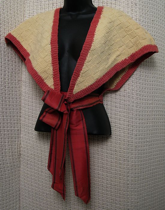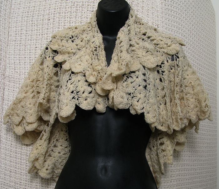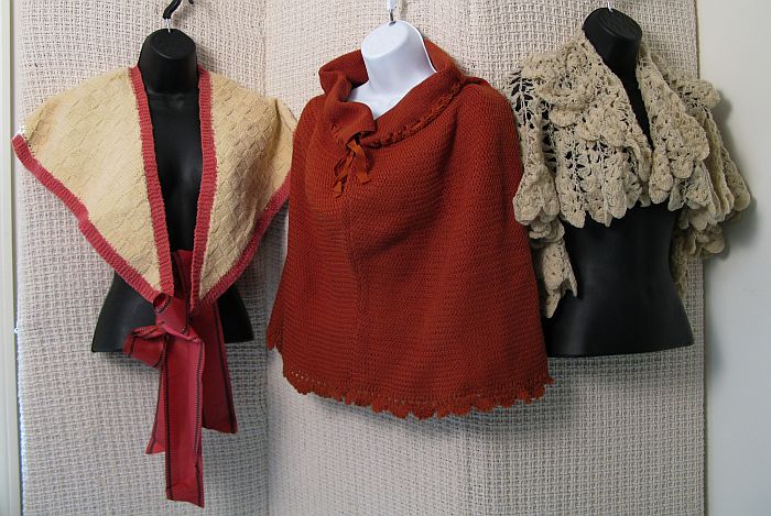 | Lot 32. Lot of 3 Mid 19th Century Vintage Wool Knit/ Crocheted Capelets Ivory Wool Lace caplet, Ivory with rose trim and ribbon ties, Sienna knit, drawstring collar. Condition: V Good, no holes or stains. $200-250 |