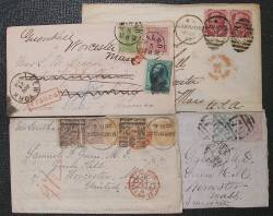 Session V This auction features postal ephemera from the 1790s up, and was not a collection as such, but rather an accumulation of generations of the Green families correspondence. This collection has never seen the light of day; most all stamped covers have contents. Starting with a 9x1, and half a local carrier 1¢ Dupuy & Schenck, 4 Sc #1 Franklins with jumbo margins on cover, one with and early R.R. Cancel All with Weiss Certs.. There is a wide sampling of 1851 1¢ and 3¢ including, carrier covers, #s10a, 25, 26a, and a #11 3¢ due with a Mass Commonwealth document. We have blackjacks in carrier, and locals. A unique set of 3 covers #64 Pink, 64a Pigeon Blood, and #64 Rose Pink all one town, Pestigo, Wisc. All with Weiss Certs. We have 2 books of mini covers, 4 books of fancy cancels (19 each book), most of the 1800s to the banknotes of high value single stamps in used fine to very fine condition, including an SC #99 split grill, also a lime green cancel on #114 Weiss Cert. There are 13 boxes of 100 to 200 covers from 1851 to 1930s in each box. In Foreign covers (All high value covers are Weiss Cert.) we offer 4 Chili, 3 bisects from the mid 1850s, high value covers from Denmark, Germany, Great Britain, Sweden, and Swiss with multiple use stamps, and cancels with contents. Also, early India, and Ceylon, with 'too late' auxs., precanceled pen script cancel on stamps for theft protection with contents from Dr. Green a Baptist Minister, and a collection book of post cards, used and unused, plus a small set of British, and Ceylon used stamps, and 2 shoe boxes of foreign covers. For sale hundreds of stampless covers starting with 2 books of 65, and 27 Stampless Hand Carried Maritime Ships Mail to/from Worcester to Canton, and Whampoa Missionary in China describing daily life from 1843 to 1847. many interesting stories. One cover is addressed to 'Dr. Green Atlantic Ocean near the Equator'. We have many Stampless Maritime Ship Mail, Steamships,and Ship with numerals, some Inland Waterways, including ships names,Way Mail, Straight Line, Manuscript Town Postmarks, Franklin Marks, Local Carrier Marks,Postmaster Free covers, a collection of South Carolina mail from Post Master Samuel Green to his son at Rhode Island College (Brown Univ.) from 1799 to 1824. 250 stampless covers in 25 booklet lots, 10 to a lot of N.E. Towns. Finally there are some Free Frank President, and President to President Covers, such as Washington to Monroe, Monroe to Madison, Gen. Jackson to Monroe, Jefferson to Monroe, etc. Click on Andrew H. Green Estate Auction, Session IV and reference lots 109 -117 for letter contents.