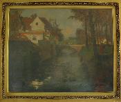 | Lot 14. Landscape with thatched-roof home and stream European School (19th century). E P lower right. Oil on board 6 3/4 x 9 3/4 in. Framed under glass. (Good) $400 - 500 |