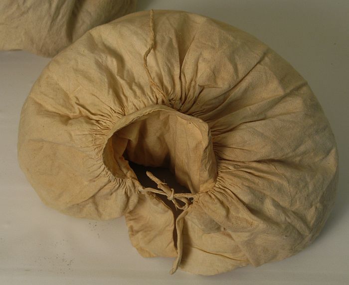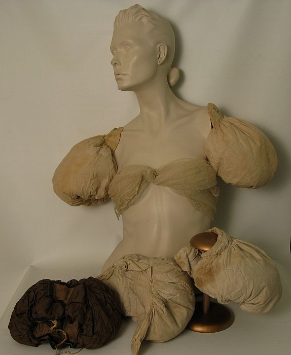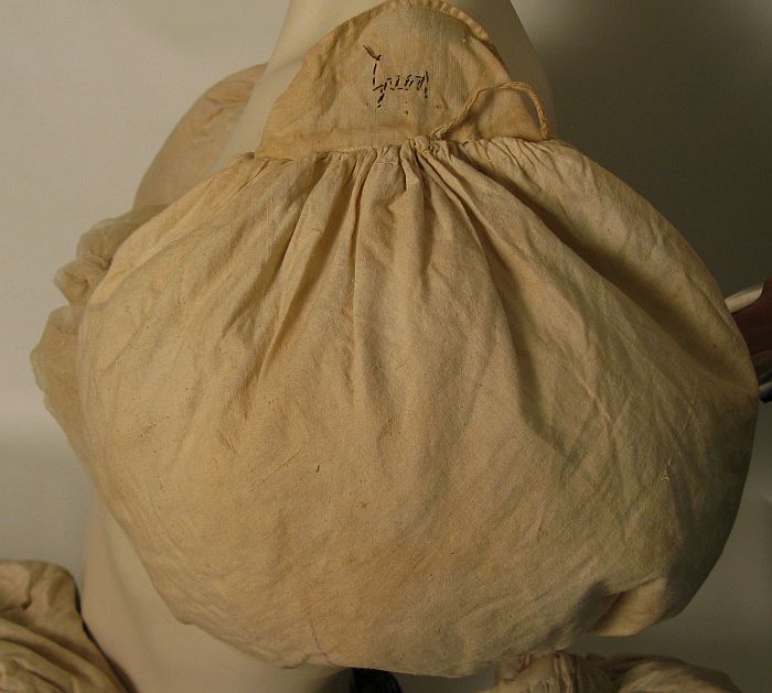 Lot 15. Rare 1820's Gigot Sleeve Down Pads A matching pair (Embroidered on both cotton tabs with the Greene name) & three single down filled cotton covered sleeve pads with three string ties on each for attaching inside low riding sleeve poufs in Gigot sleeves.. Condition: VG with expected age toning . $400-600 |