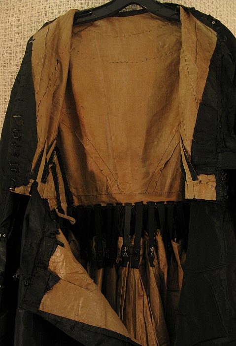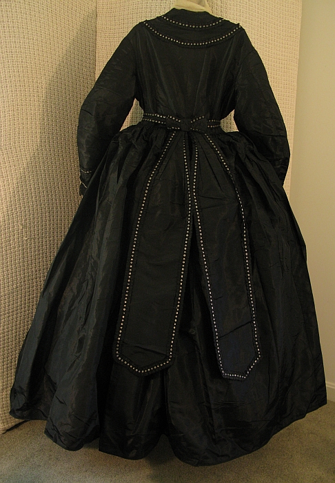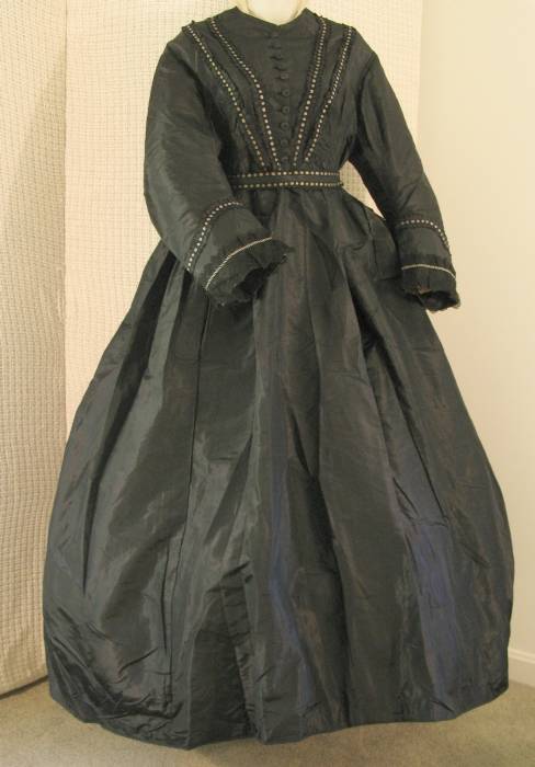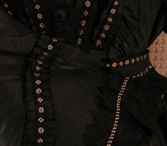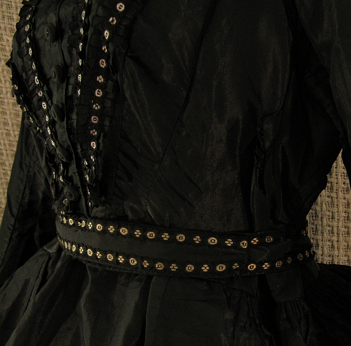 | Lot 5. Circa 1870's Black Silk Taffeta Bustle Dress/Gown Diagonal black silk box pleated trimmed bodice with tiny ivory floral embroidered center ribbon, covered buttons with jet centers, silk lace ruffled cuffs. Floor length sash/panel w embroidered grosgrain ribbon inset, cartridge pleated waist at back,16 hook/eye bustle straps inside skirt, polished cotton lining. Cond: EXC $600-800 |