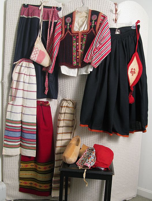| Lot 8. Lot Complete Vintage Dutch Fashion Ensemble with Accessories Handcrafted wool embroidered, fully boned vest with emb trim. Navy wool skirt with woven red piping, red wool winter apron with woven border, navy cotton summer apron, linen & lace cap, wooden shoes. With two ivory cotton aprons, red 7 white crocheted/monogram purse. Condition: Excellent $400-600 |