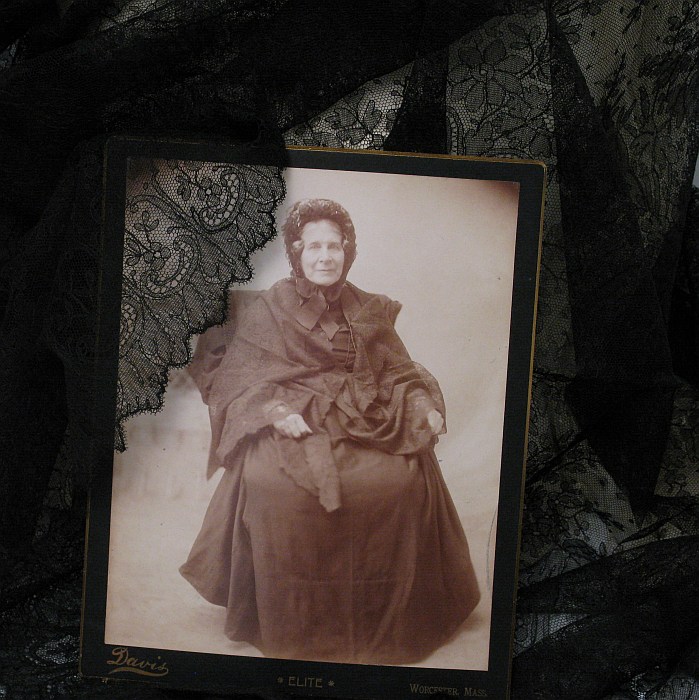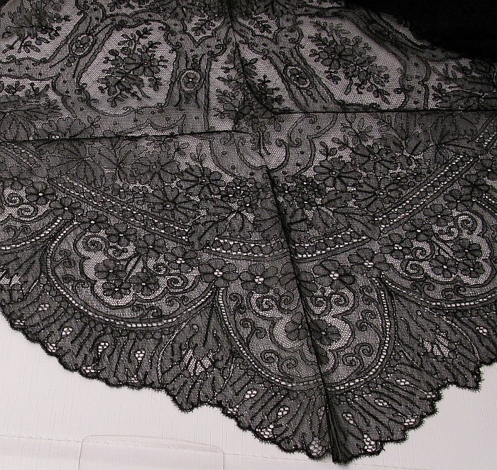 | Lot 9. Fine Black Chantilly Lace Shawl Mid 19th Century, Mary Ruggles Green Shawl with photo of Mary Ruggles Green wearing shawl. Large Floral Sprays, Garland Borders against sheer black net ,Triangle 108" x 148" x 50", Condition: EXC $400-500 |