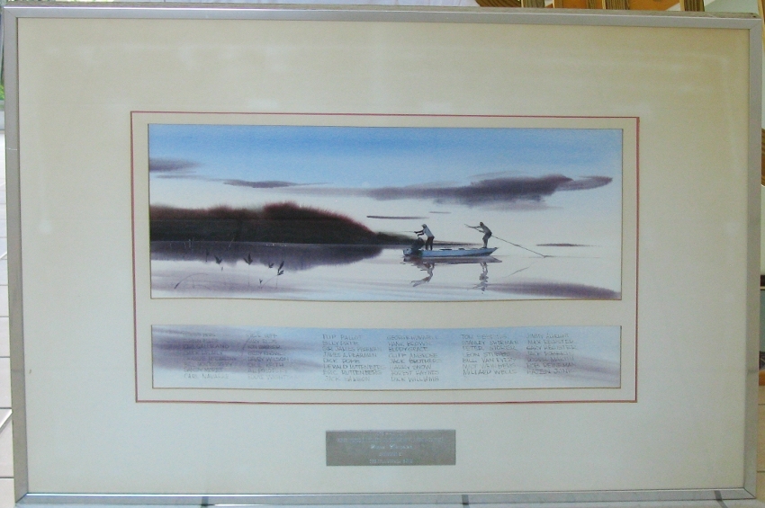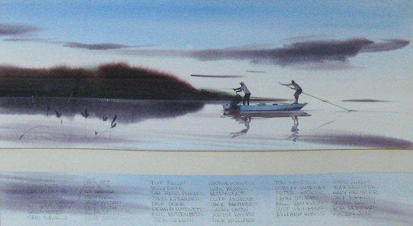 BACK | Scroll down for multiple images Lot 6. Millard Wells Watercolor - 14 1/2" x 21 1/4", "First World Invitational Bonefish Fly Championship Grand Champion 1978 4th Year". Bottom part of the painting lists names of 23 anglers with their captains [6] (Very good condition) | |